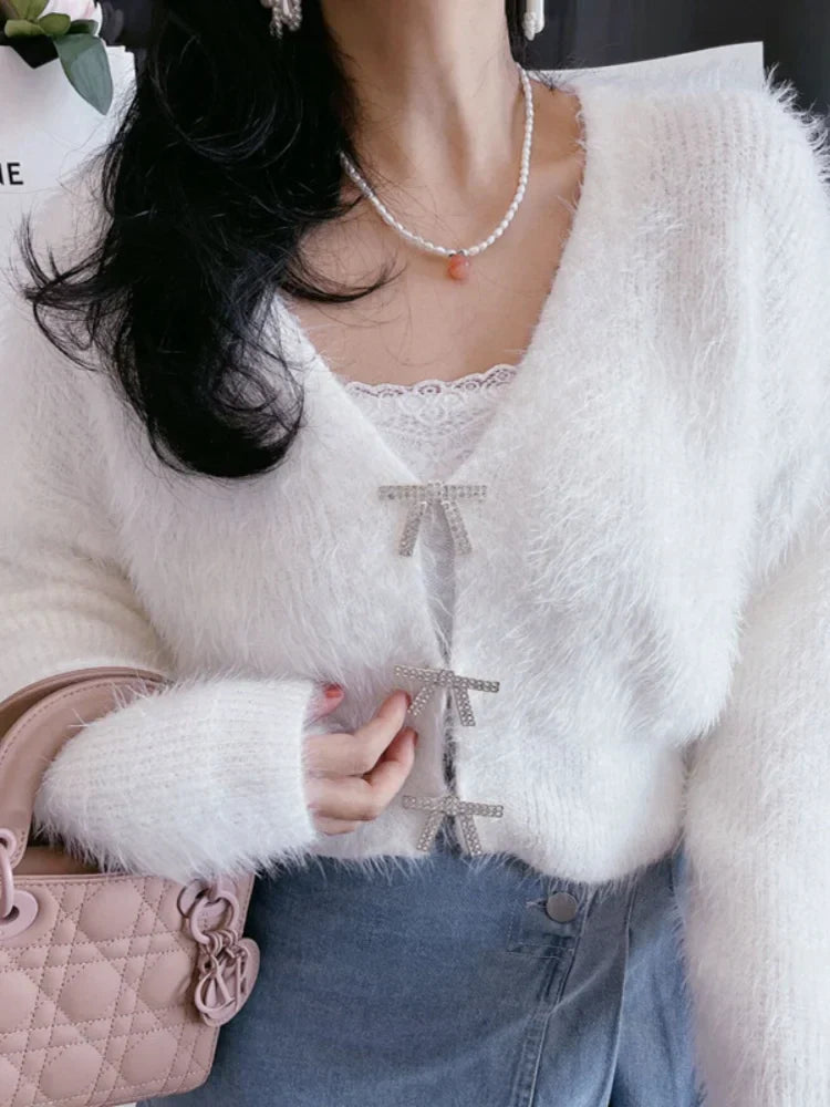 This cozy cardigan features stunning bow-shaped crystal embellishments, giving you the perfect mix of comfort and glam. Ideal for casual outings or evening events, it adds a chic touch to any outfit while keeping you warm. Elevate your wardrobe with this must-have statement piece that shines on any occasion!