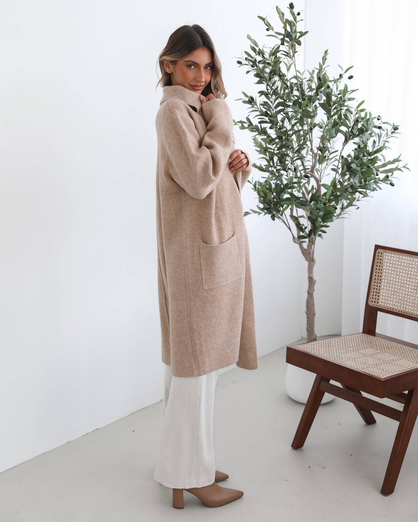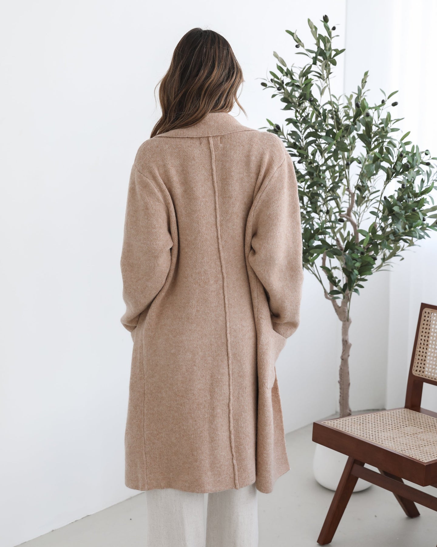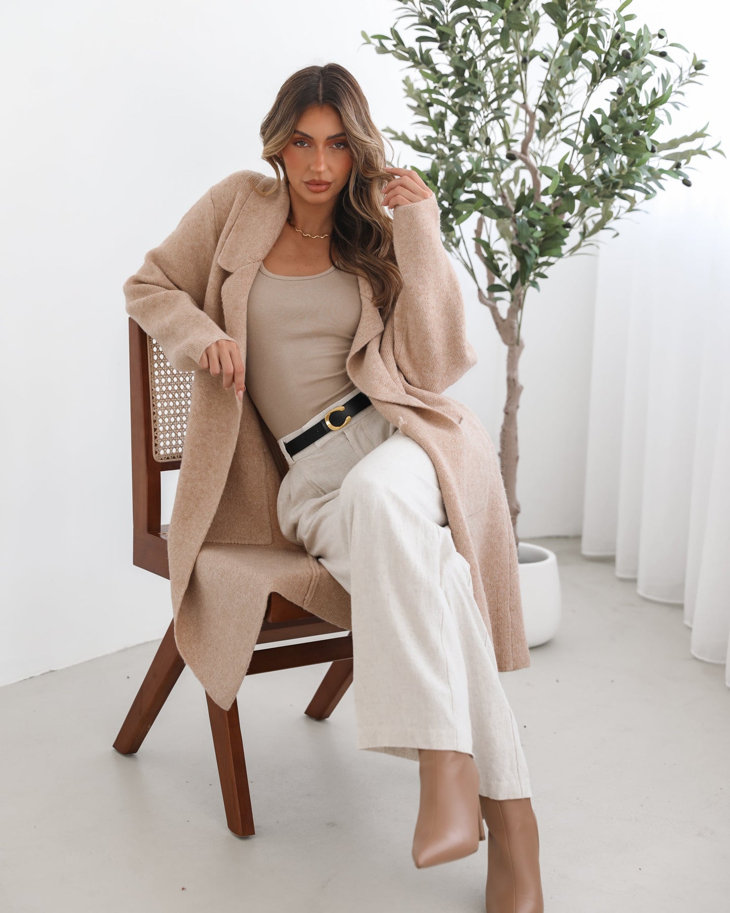 Elevate your style with the Carranza Coatigan—where classic design meets comfort for everyday elegance in a warm camel shade.