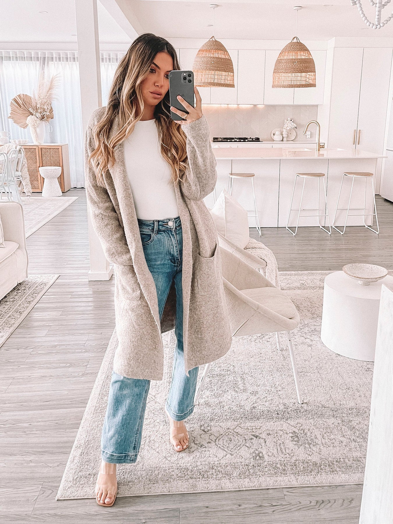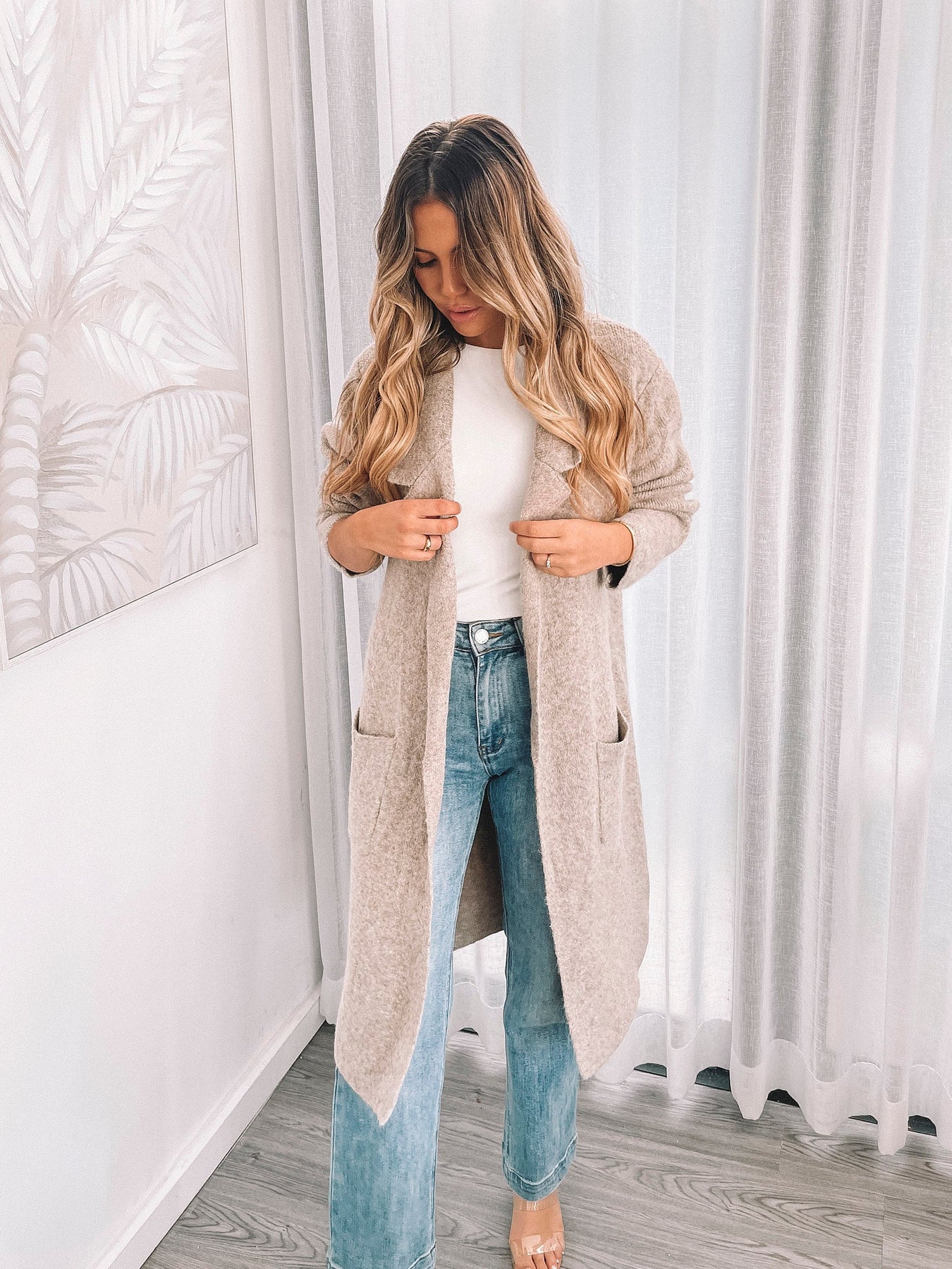 Step into style and comfort with this chic beige Coatigan, perfect for adding elegance to any outfit, day or night.
